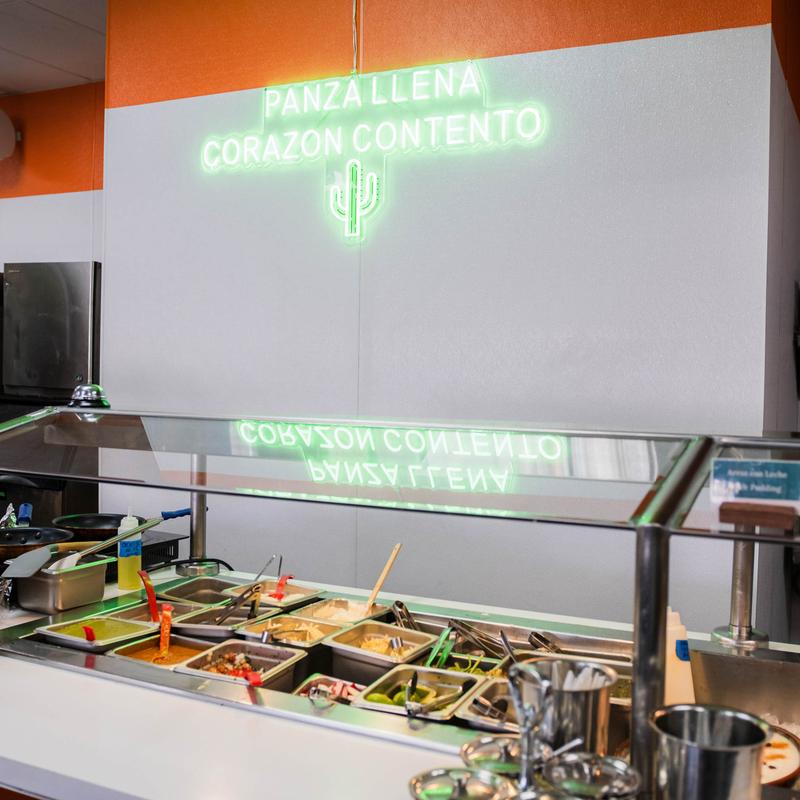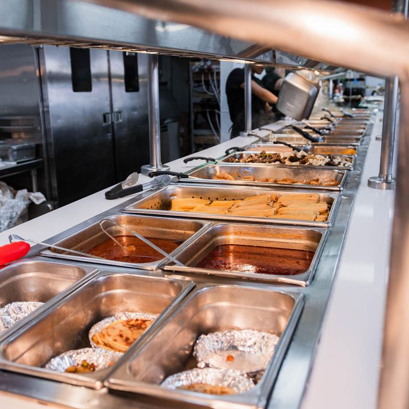 R: Nuestro sistema servido ayuda a que la fila avance más rápido y mantiene la comida fresca. Los fines de semana entre 11am–1pm puede haber espera por alta demanda.