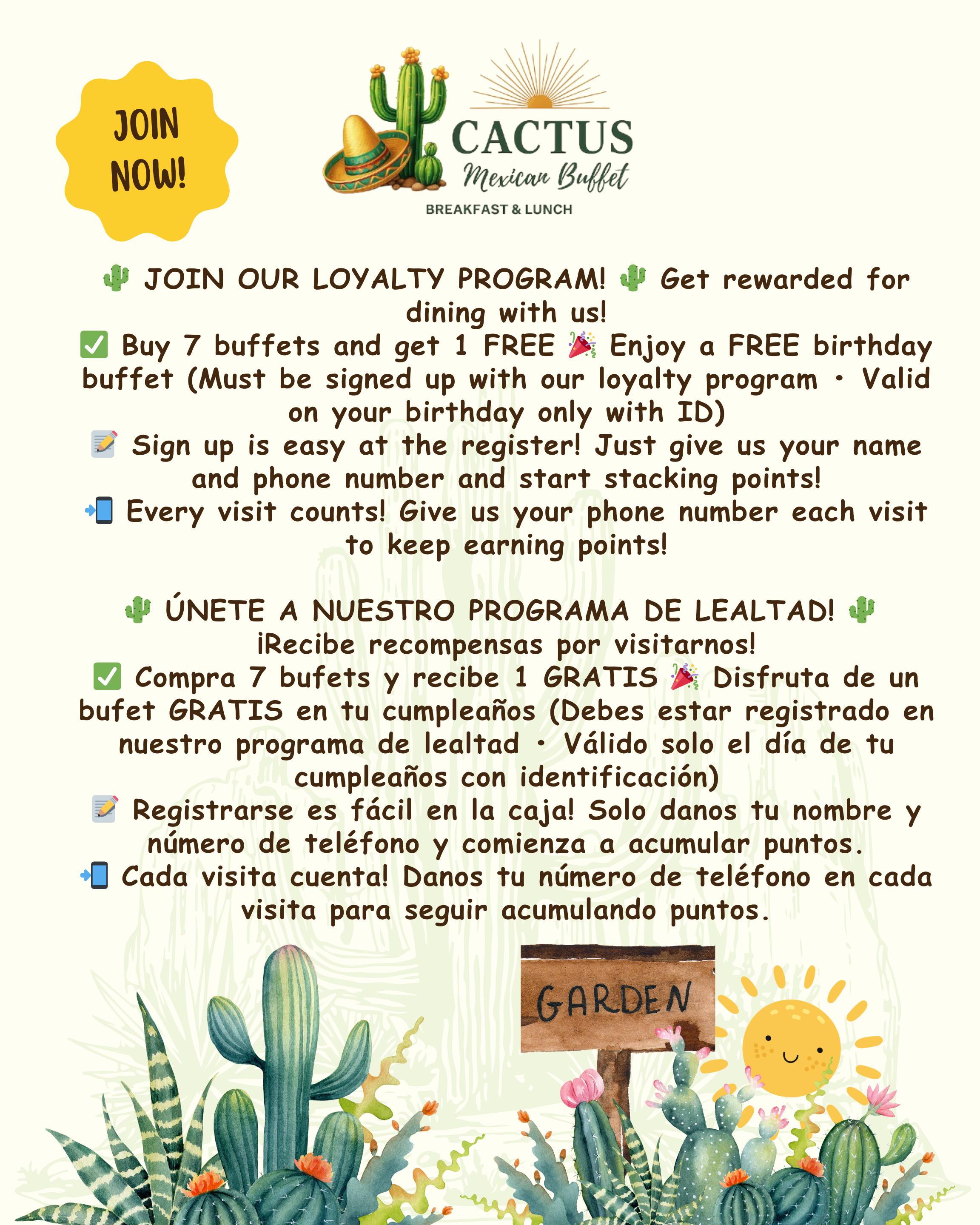 At Cactus Mexican Buffet, our mission is to share the authentic flavors, warmth, and traditions of Mexican cuisine with every guest who walks through our doors. We are committed to preparing fresh, homemade dishes with quality ingredients, offering generous portions, and maintaining a clean, inviting buffet that families can trust.